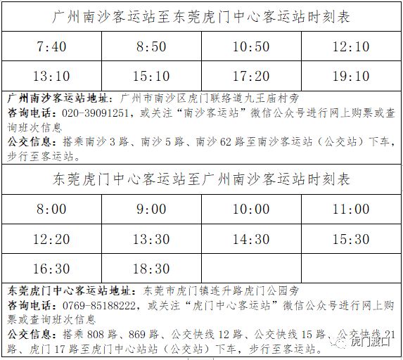 目前,广州南沙至东莞虎门有固定的客运班线,每天对开,单程票价20元,具体情况如下: