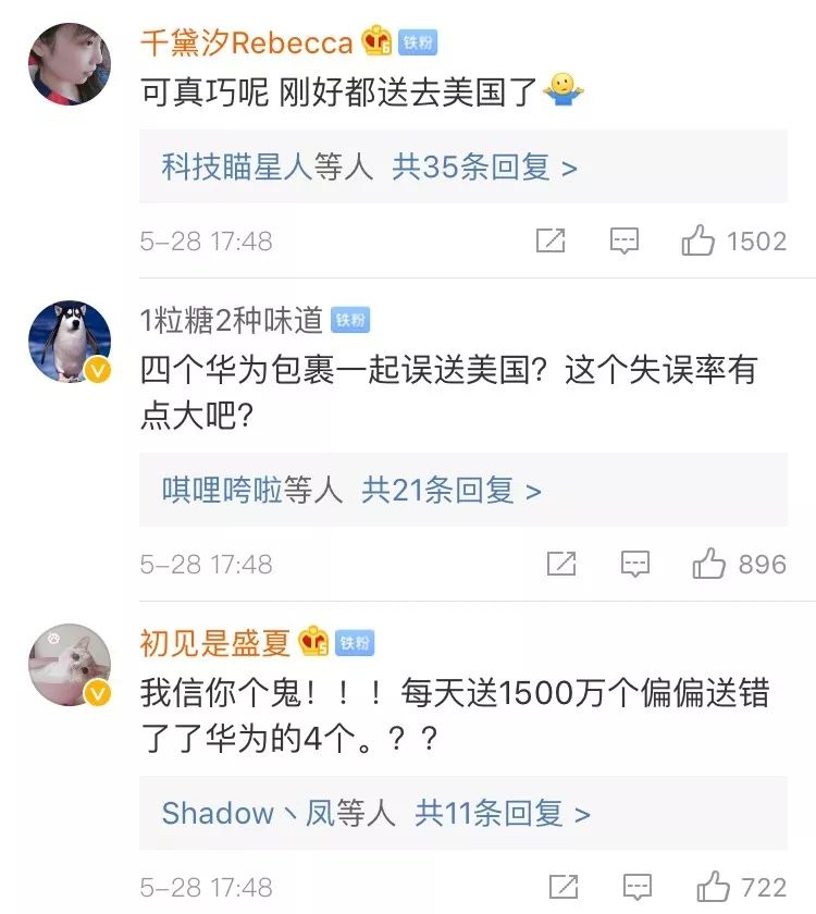 另外,5月17日华为还从越南河内寄出2个包裹,收货地分别为华为在中国香港和新加坡的办公室。但在21日,2个包裹抵达中国香港和新加坡后,被联邦快递两地的转运站扣押,运货状态显示“出现异常”。