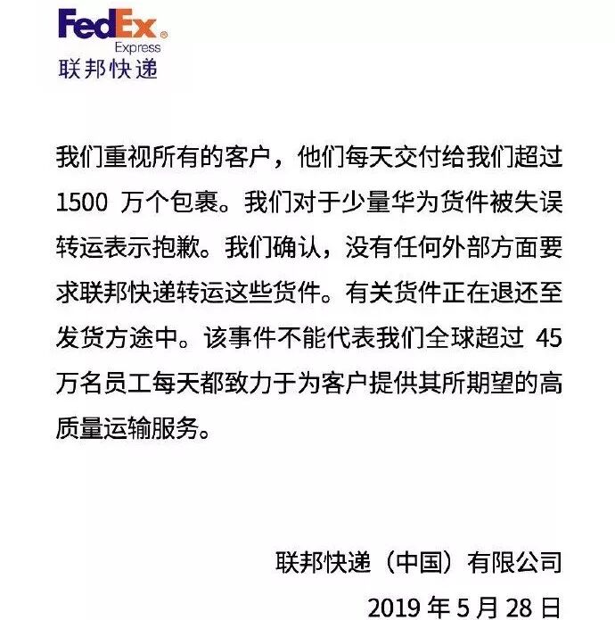 据路透社28日报道,近期,美国联邦快递在未说明的情况下,将华为的包裹转移到美国。联邦快递今日表示,“对于少量华为货件被失误转运表示抱歉,没有任何外部方面要求联邦快递转运这些货件。”
