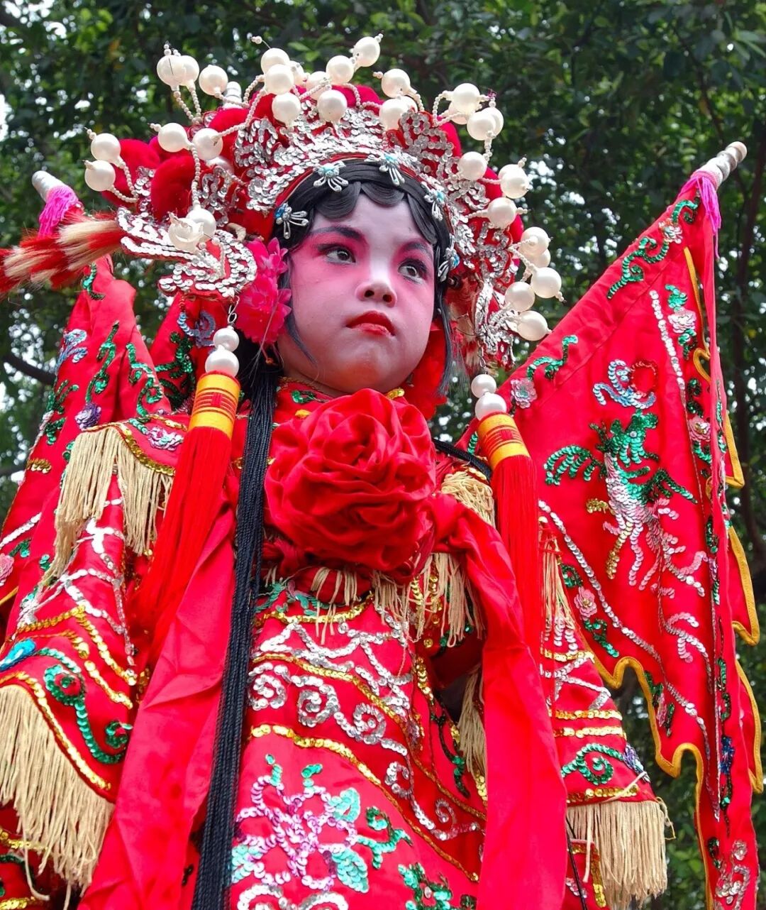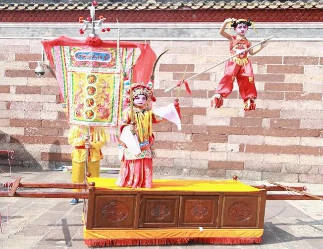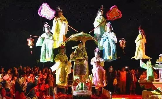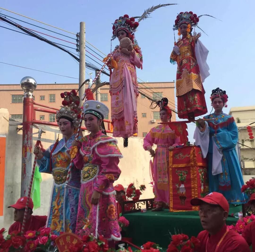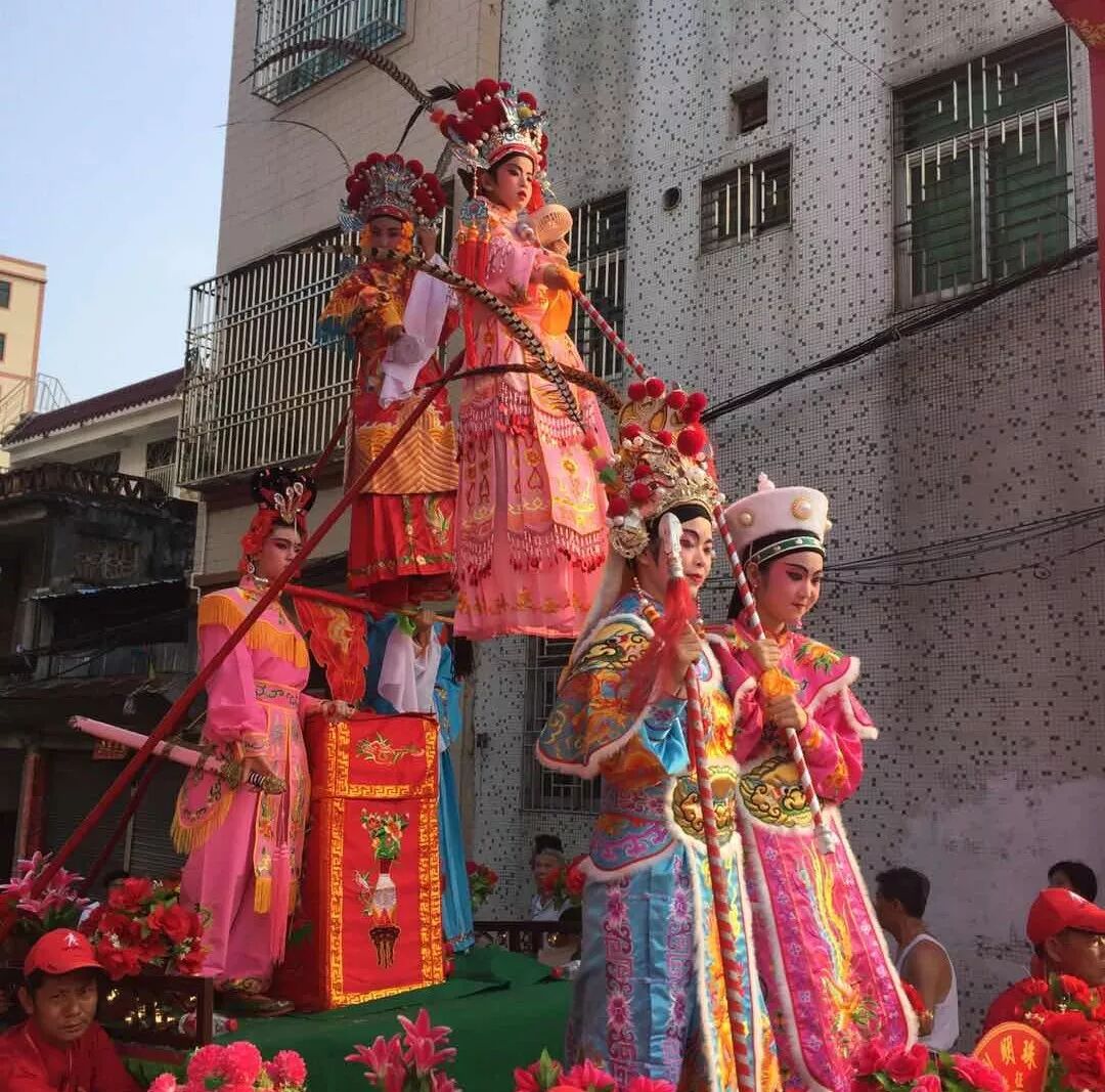取材传统戏剧或神话传说人物,粤剧风格打扮,配以八音班奏乐,声、色、艺组合表演。