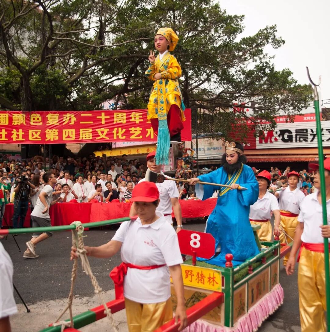 崖口飘色:源于唐代“耍菩萨”祭祀民俗,后称为“出会景”、“枭色”、“飘色”