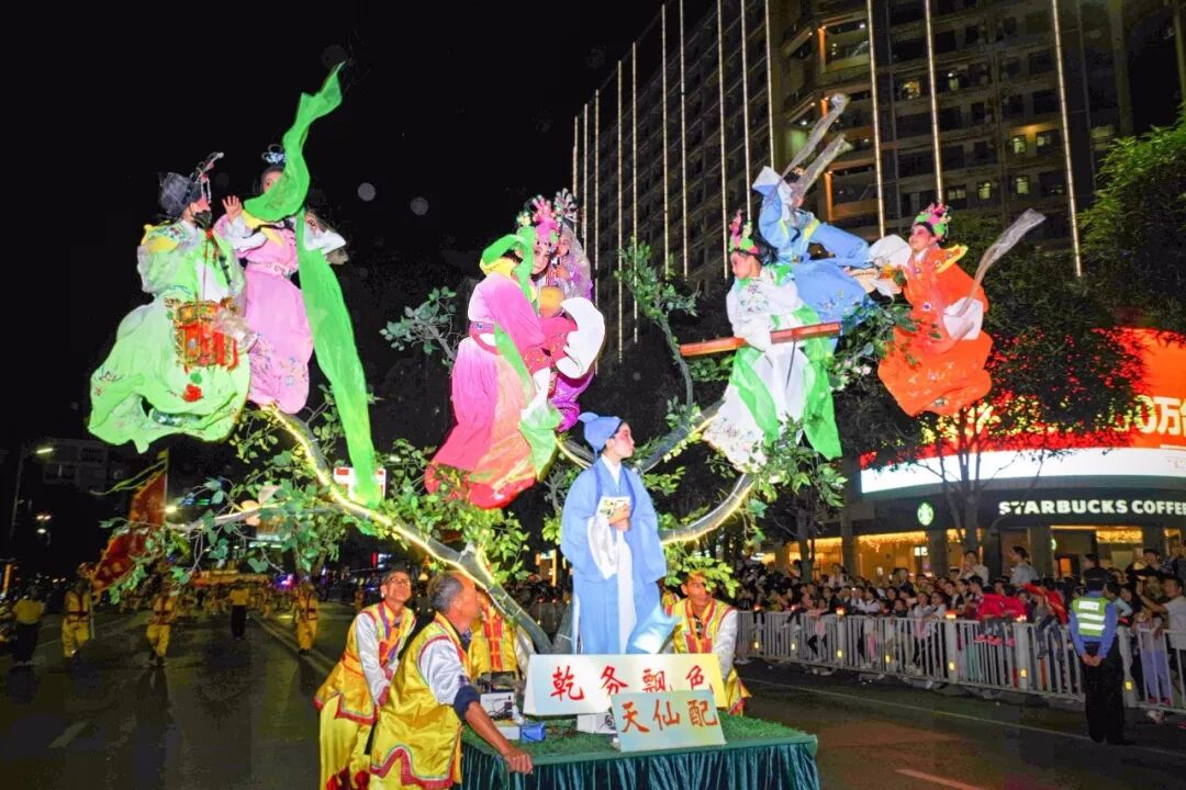 以色版故事衬饰,辅之以醒狮、旗牌、高跷、秧歌、腰鼓以及八音锣鼓等巡游。