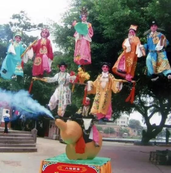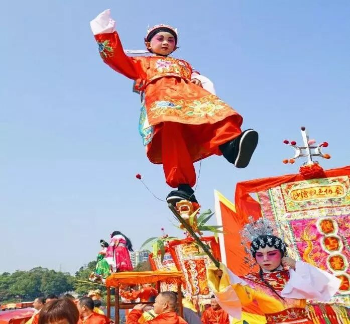 浮石飘色:始于明末清初,取材历史故事人物,把造型艺术与杂技融为一体。