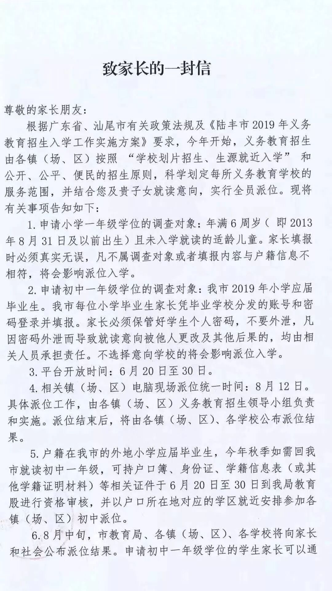 根据广东省、汕尾市有关政策法规及《陆丰市2019年义务教育招生入学工作实施方案》要求,今年开始,义务教育招生由各镇(场、区)按照 “学校划片招生、生源就近入学”和公开、公平、便民的招生原则,科学划定每所义务教育学校的服务范围,并结合您及贵子女就读意向,实行全员派位。现将有关事项告知如下: