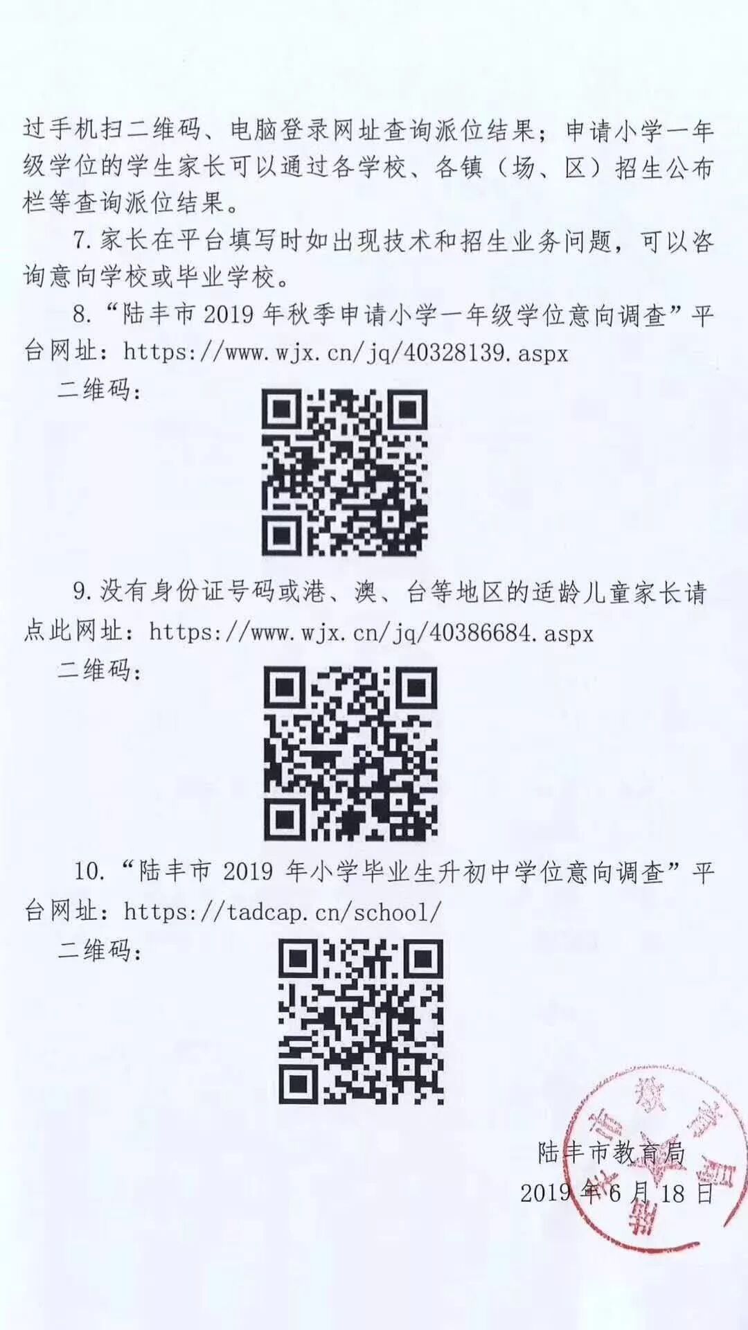 10.“陆丰市2019年小学毕业生升初中学位意向调查”平台网址:https://tadcap.cn/school/