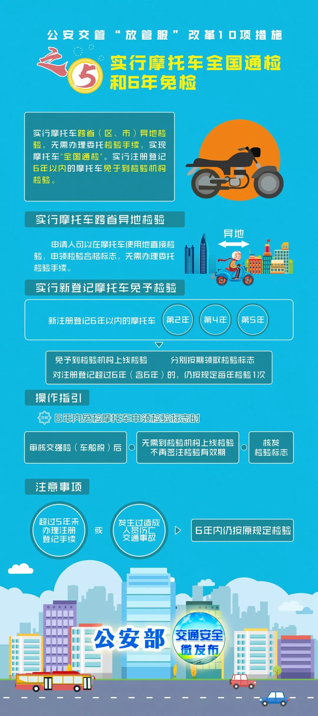 在已推行汽车全国通检的基础上,进一步放开摩托车跨省(区、市)异地检验。同时,对注册登记6年以内的摩托车,免予到检验机构检验,切实减轻群众特别是广大农村地区车主检车负担,助力脱贫攻坚、乡村振兴。