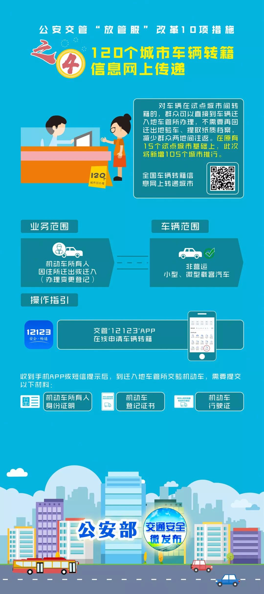 将车辆转籍信息网上转递试点城市由15个扩大到120个,车辆在试点城市间转籍的,可以直接到车辆迁入地申请,不再需要到迁出地车管所提取档案、查验车辆,减少群众两地间往返。