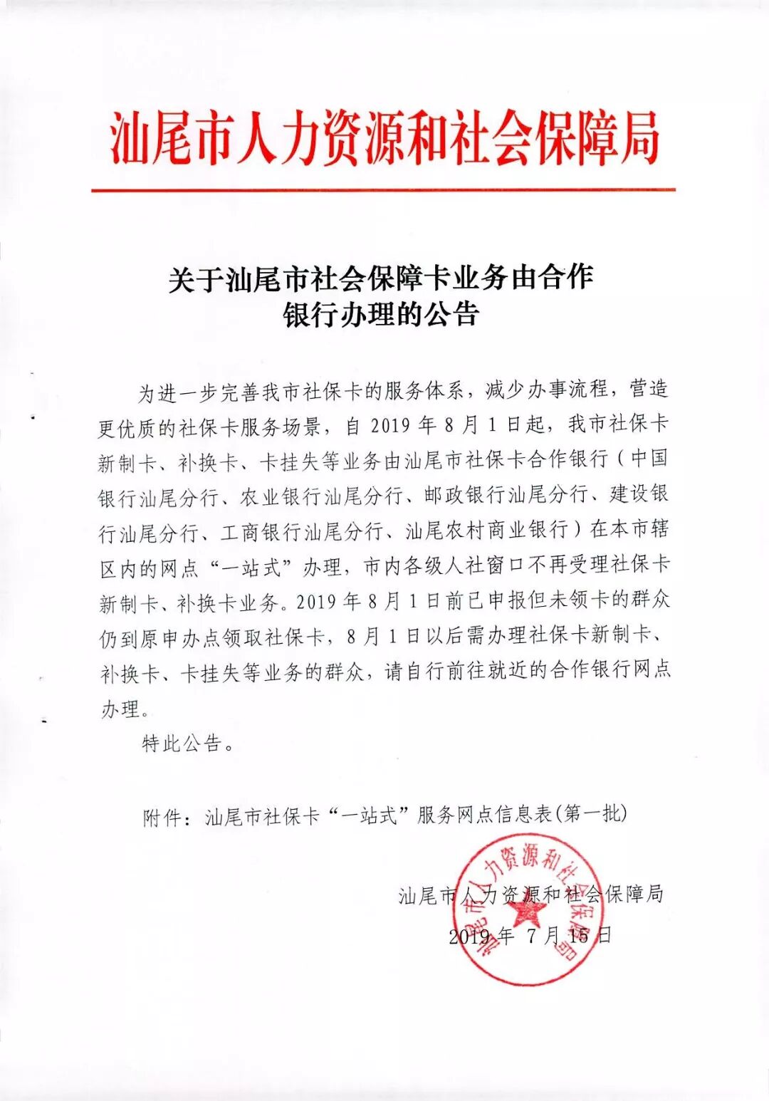 为进一步完善我市社保卡的服务体系,减少办事流程,营造更优质的社保卡服务场景,自2019年8月1日起,我市社保卡新制卡、补换卡、卡挂失等业务由汕尾市社保卡合作银行(中国银行汕尾分行、农业银行汕尾分行、邮政银行汕尾分行、建设银行汕尾分行、工商银行汕尾分行、汕尾农村商业银行)在本市辖区内的网点“一站式”办理,市内各级人社窗口不再受理社保卡新制卡、补换卡业务。2019年8月1日前已申报但未领卡的群众仍到原申办点领取社保卡,8月1日以后需办理社保卡新制卡、补换卡、卡挂失等业务的群众,请自行前往就近的合作银行网点办理。