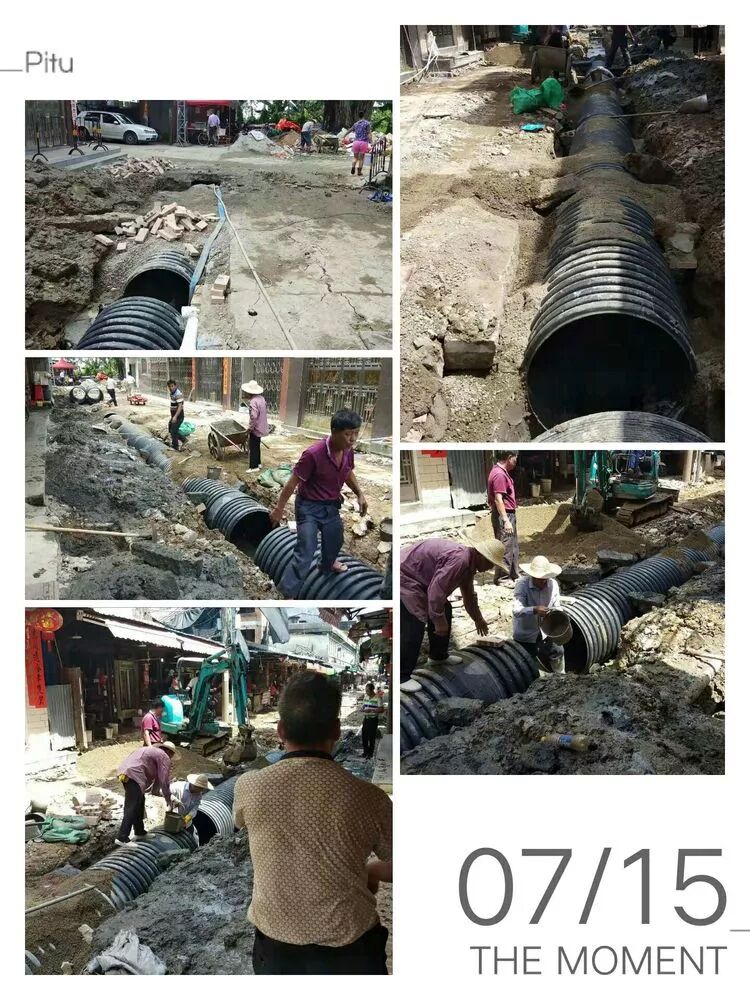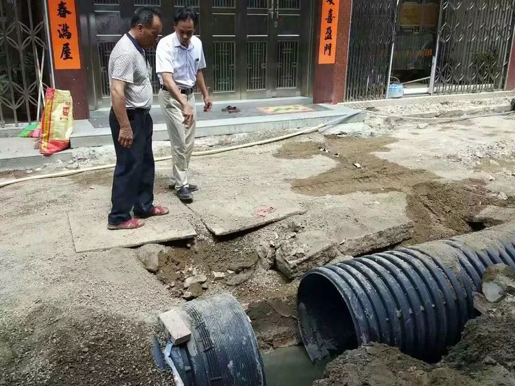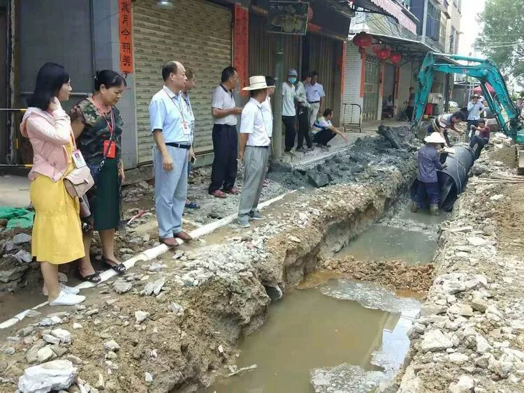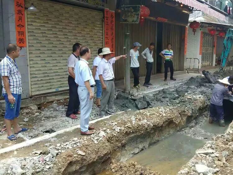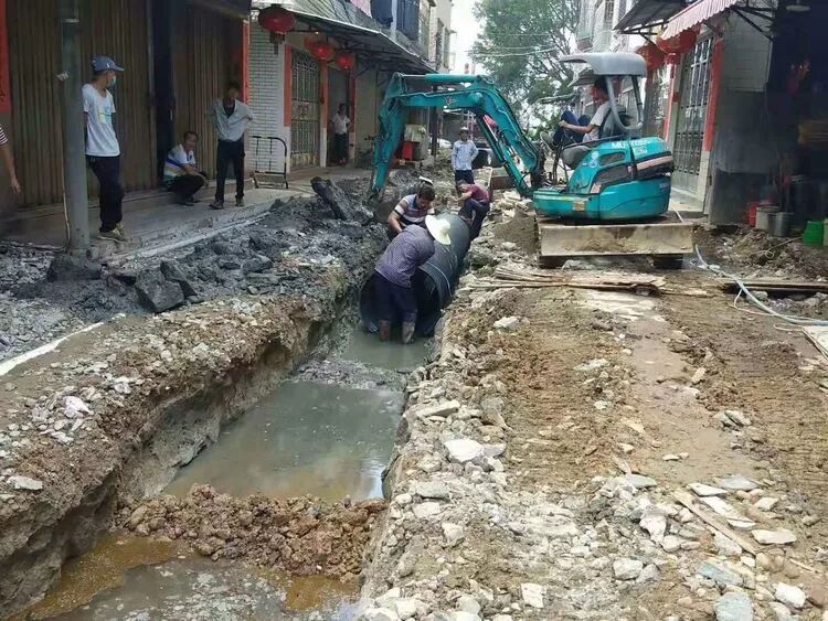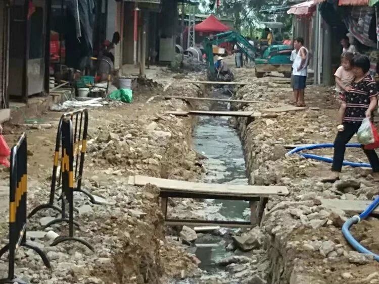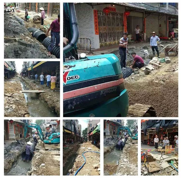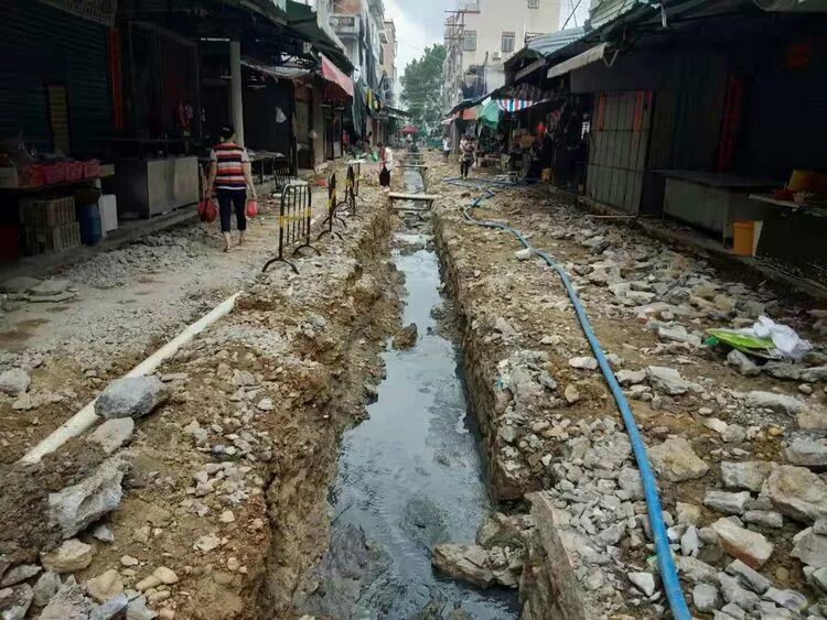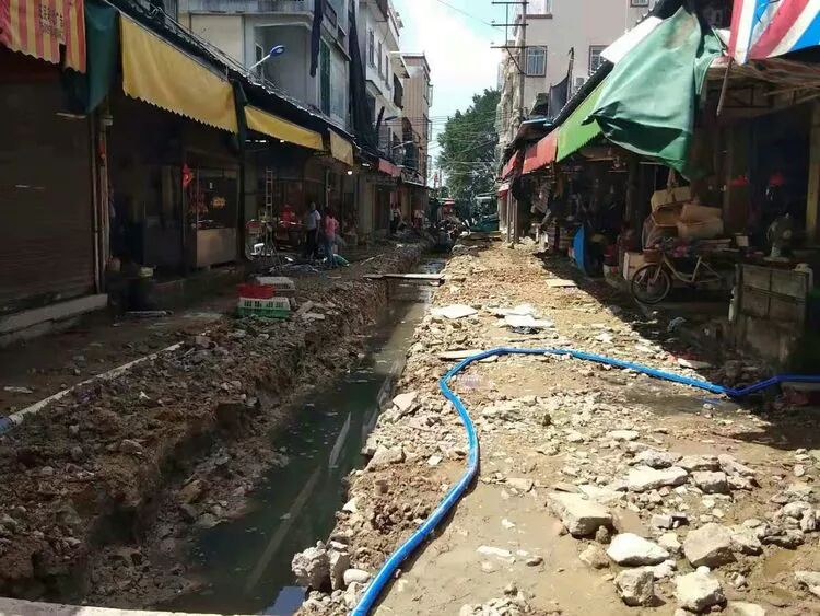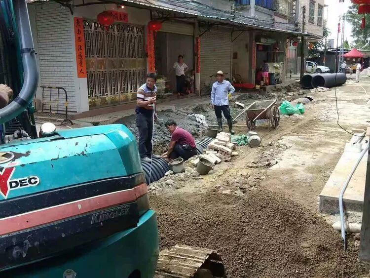 挖沟填土,建筑工人正按部就班,有条不紊的进行工程施工,沿途街铺业主认真配合,目前正进行下水道铺设,工程进展顺利。