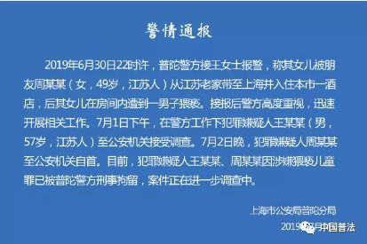 7月3日晚,上海市公安局普陀分局官方微博发布通报称:6月30日22时许,上海普陀警方接王女士报警,称其女儿被朋友周某某(女,49岁,江苏人)从江苏老家带至上海并入住本市一酒店,后其女儿在房间内遭到一男子猥亵。7月1日,在警方工作下犯罪嫌疑人王某某(男,57岁,江苏人)至公安机关接受调查。7月2日晚,犯罪嫌疑人周某某至公安机关自首。目前,犯罪嫌疑人王某某、周某某因涉嫌猥亵儿童罪已被普陀警方刑拘。(警民直通车_普陀官方微博)