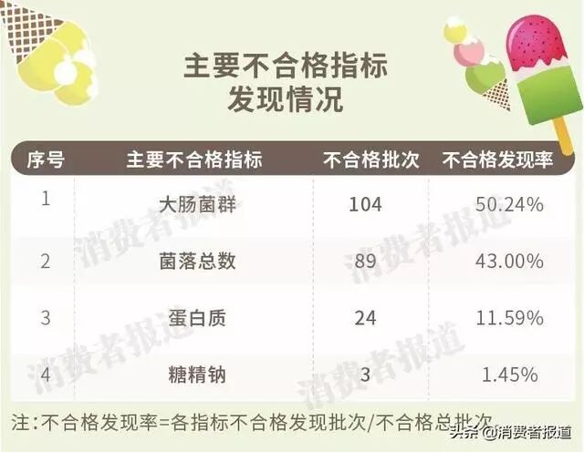 2019年7月《消费者报道》整理了国家市场监督管理局(原食药监局)在2014年1月到2019年5月公布的全国冰淇淋抽检情况,共整理相关抽检信息6646批次,合格发现率达到了96.8%,令人较为放心!而不合格发现批次为207批次,不合格发现率仅为3.1%。