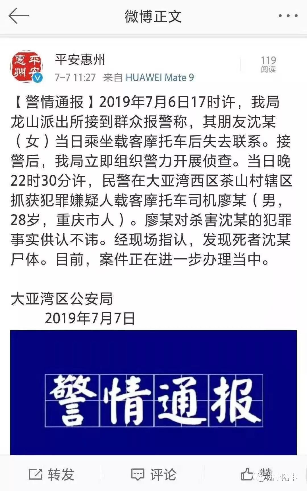 【警情通报】2019年7月6日17时许,我局龙山派出所接到群众报警称,其朋友沈某(女)当日乘坐载客摩托车后失去联系。接警后,我局立即组织警力开展侦查。当日晚22时30分许,民警在大亚湾西区茶山村辖区抓获犯罪嫌疑人载客摩托车司机廖某(男,28岁,重庆市人)。廖某对杀害沈某的犯罪事实供认不讳。经现场指认,发现死者沈某尸体。目前,案件正在进一步办理当中。
