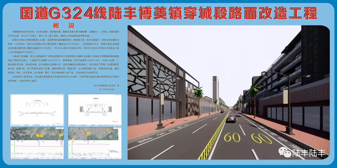 为推进工程进展,陆丰公路局委托广州市恒津路桥设计咨询有限公司编制《国道G324线陆丰博美镇穿城段路面改造工程建设方案》,工程起点为头陂桥(K641+077),穿博美镇,终点为霞绕村(K647+194),全长6.4公里,二级公路技术标准,双向四车道,设计速度60公里每小时,采用加铺改性沥青混凝土,起点至店下桥段3.3公里路基宽度16米,路面15米:店下桥至终点段3.1公里,路基宽度30米,路面19米,人行道两侧各5.5米,配套市政设施,铺设彩色砖、绿化,排水管道、给水管道、路灯、电力电信线缆入地工程,工程总造价7000多万元。