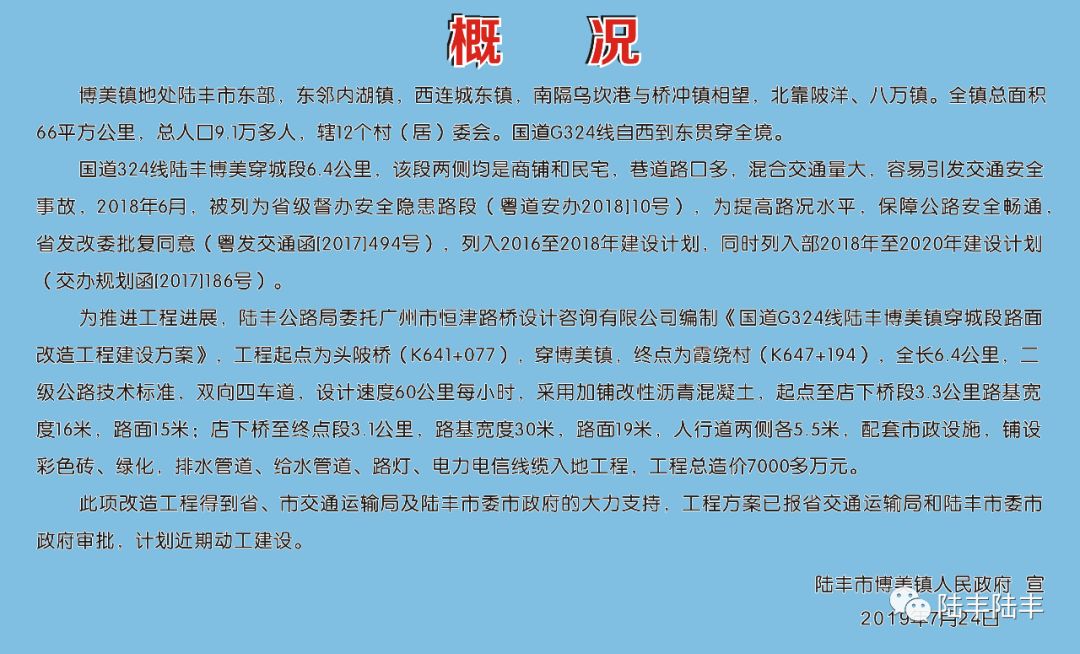 国道324线陆丰博美穿城段6.4公里,该段两侧均是商铺和民宅,巷道路口多,混合交通量大,容易引发交通安全事故,2018年6月,被列为省级督办安全隐患路段(粤道安办2018J10号),为提高路况水平,保障公路安全畅通,省发改委批复同意(粤发交通函[2017]494号),列入2016至2018年建设计划,同时列入部2018年至2020年建设计划(交办规划函【2017】186号)。