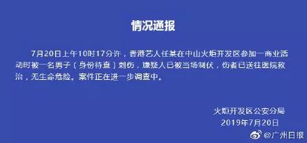 7月20日上午10时17分许,香港艺人任某在中山火炬开发区参加一商业活动时被一名男子(身份待查)刺伤,嫌疑人已被当场制伏,伤者已送往医院救治,无生命危险。案件正在进一步调查中。