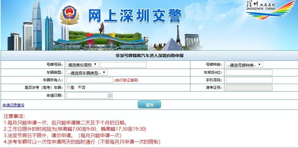 2、也可登录深圳市交警局网站,进入“非深号牌载客汽车进入深圳自助申报”入口,进行提前申报,可以“豁免”每月1次在限行时段、路段行驶。