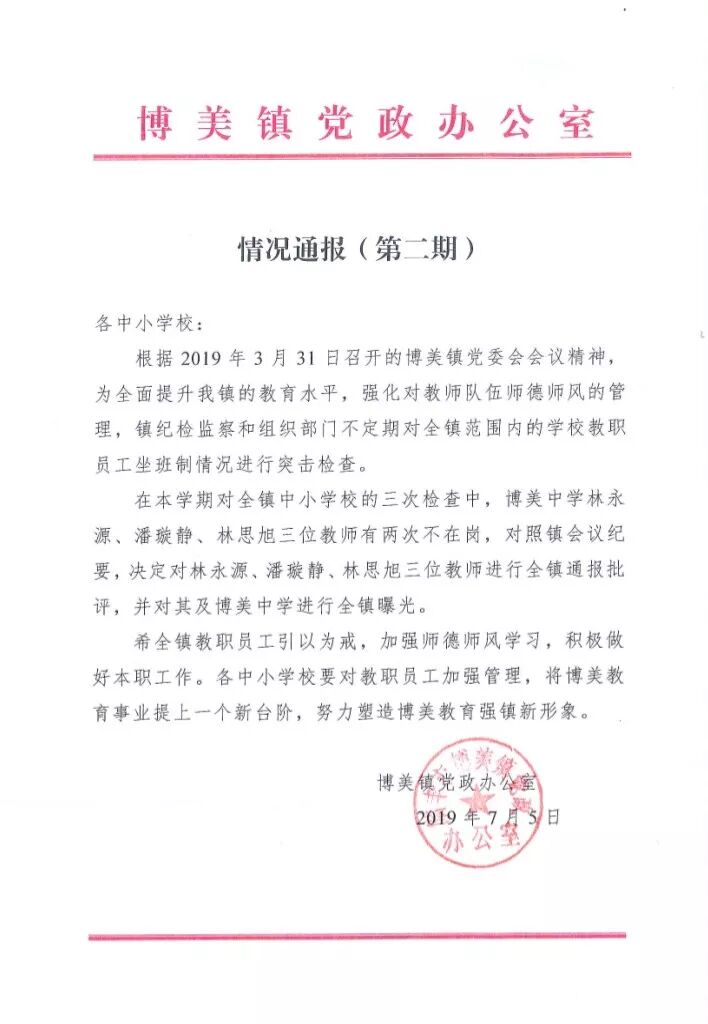 在本学期对全镇中小学校的三次检查中,博美中学林永源、潘璇静、林思旭三位教师有两次不在岗,对照镇会议纪要,决定对林永源、潘璇静、林思旭三位教师进行全镇通报批评,并对其及博美中学进行全镇曝光。