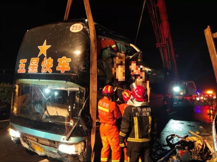 阳西消防中队立即向消防大队报告,并向阳江消防支队指挥中心报告请求增援,调派最近的程村消防专职队赶赴现场。首先到场的交警、路政部门已将部分伤者乘客疏散出来。