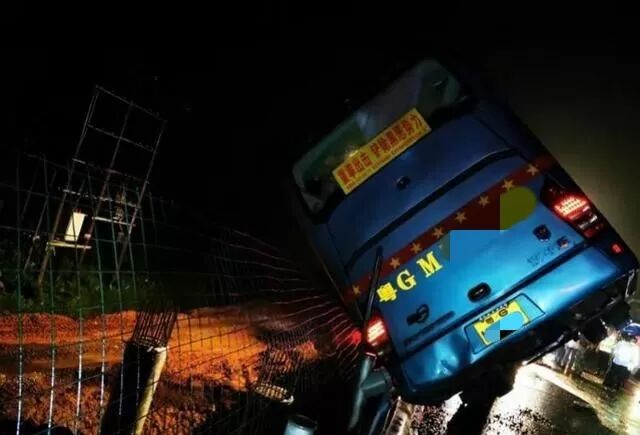 0时33分阳西消防中队到场后,经侦察发现(车牌号:GMXXXX)大巴撞上护栏及护栏外正处于施工的钢梁,呈45度角倾斜,后车身呈悬空状态,车内多人被困。