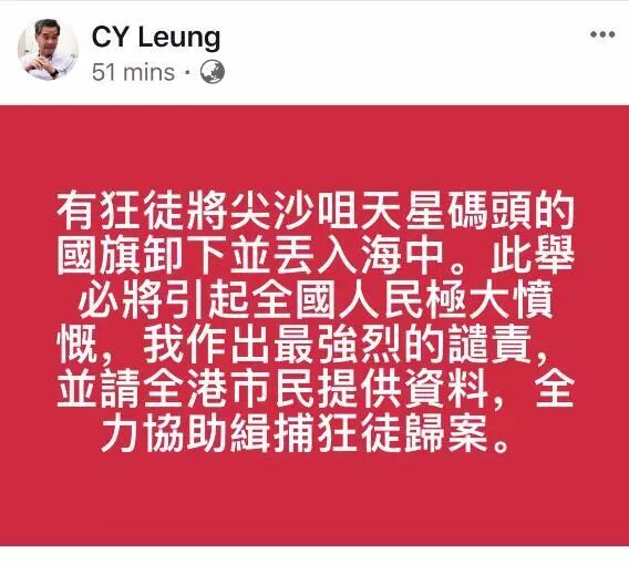 梁振英发帖表示,悬赏港币100万元,向全社会征集线索,缉捕在天星码头将国旗丢入海中的狂徒。任何公众人士向警方提供线索,一经法庭定罪,可得此悬赏。他还倡议成立悬赏基金,协助警方缉捕狂徒侮辱国家、冲击警察、破坏秩序的行为。