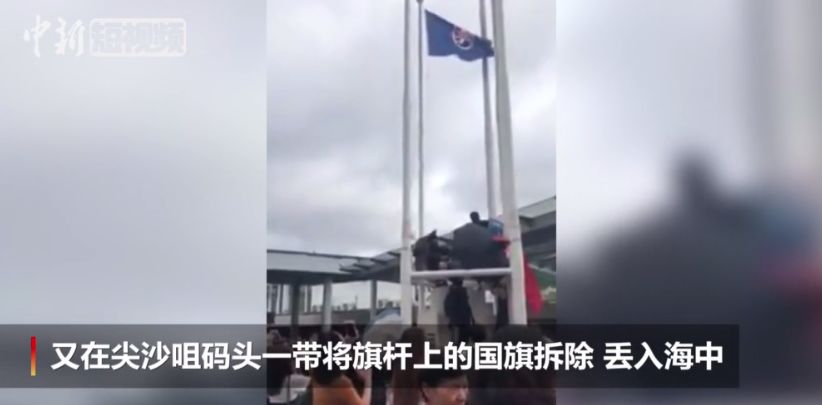 在网友发布的一则视频中,记者看到,几名一身黑衣的暴徒攀上香港一处旗杆底座,迅速将国旗降下,有同伙拿雨伞为其遮挡,动作熟练。据香港媒体报道,几人将国旗丢入海中,期间发出嬉笑声。
