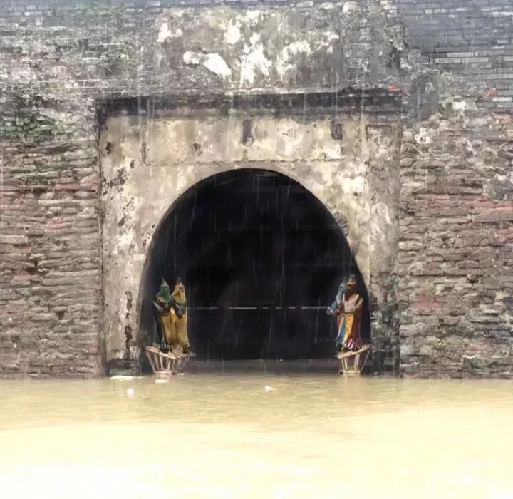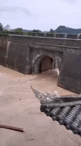 10日下午,临海古城城门“失守”,洪水涌进城内↓
