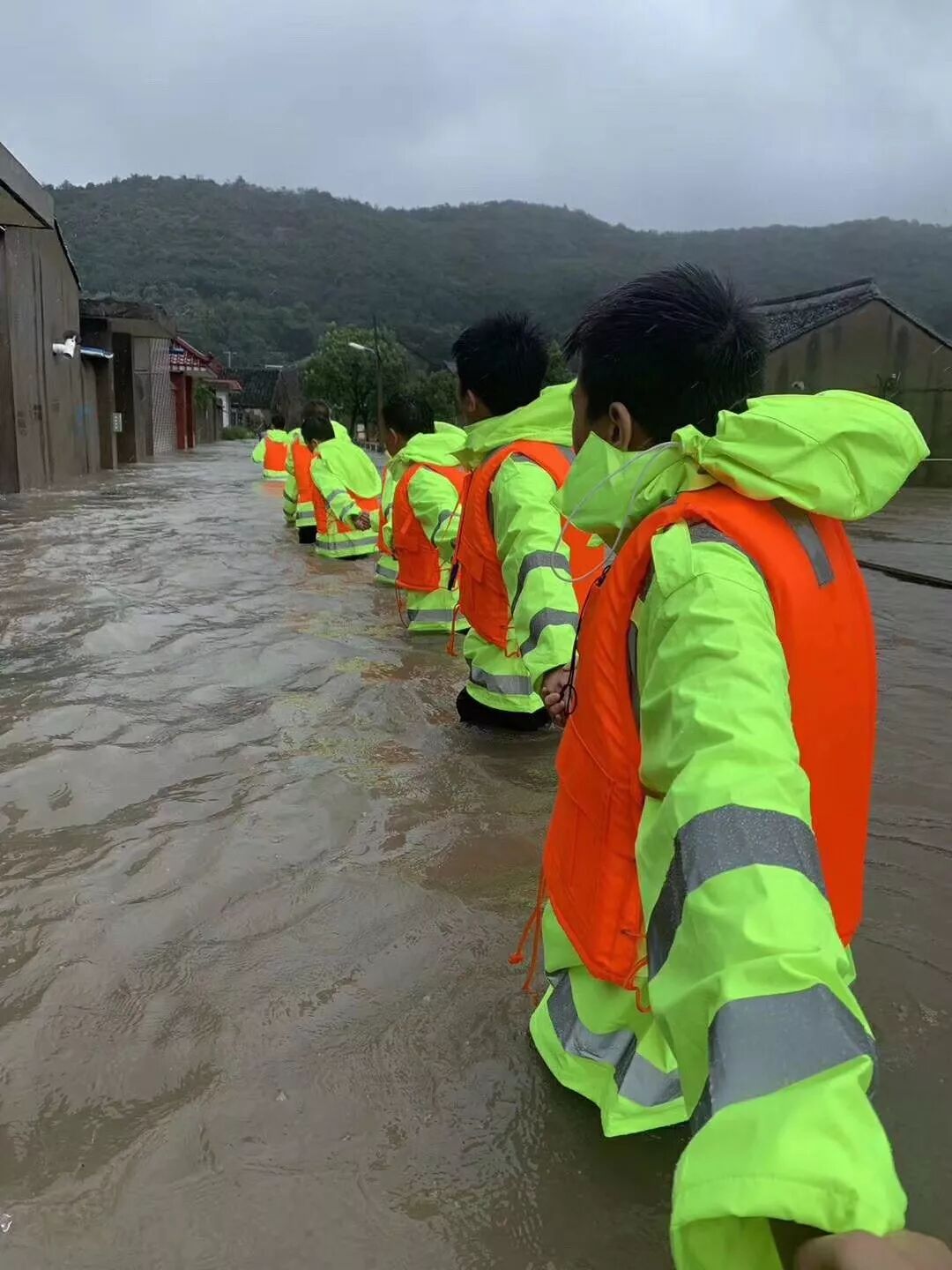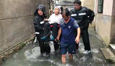宁波北仑区春晓街道春晓派出所民警正在转移受困群众。由于积水已经过腰,他们手拉手前行↓