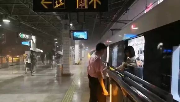 受“利奇马”影响,上海从9日晚间起雨势显著加大。狂风骤雨中,上海中山公园地铁站却上演着暖心的一幕。地铁站务员正在全神贯注监控列车到发,一位女乘客为浑身湿透的站务员递上了纸巾,让他擦去雨水↓