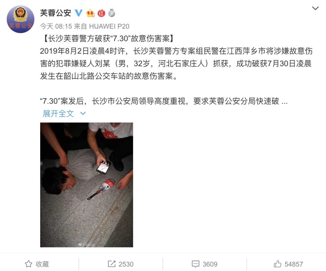 8月2日上午,长沙市公安局芙蓉分局官方微博@芙蓉公安 发布消息,2日凌晨4时许,长沙市芙蓉区公安专案组民警在江西萍乡市将涉嫌故意伤害的犯罪嫌疑人刘某(男,32岁,河北石家庄人)抓获。