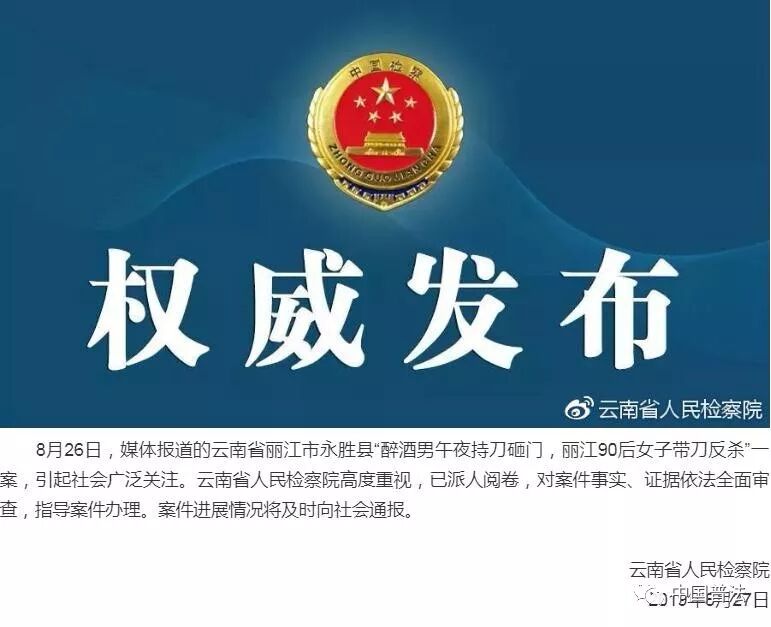 8月26日,媒体报道的云南省丽江市永胜县“醉酒男午夜持刀砸门,丽江90后女子带刀反杀”一案,引起社会广泛关注。云南省人民检察院高度重视,已派人阅卷,对案件事实、证据依法全面审查,指导案件办理。案件进展情况将及时向社会通报。