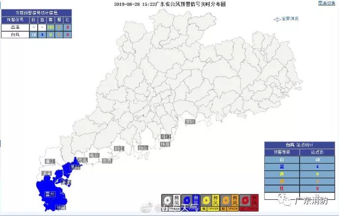 截至15点22分,湛江,吴川,雷州,徐闻4个市县已发布台风蓝色预警,廉江,遂溪,茂名,电白,阳西,阳江,台山,珠海,斗门,深圳10个市县已发布台风白色预警。