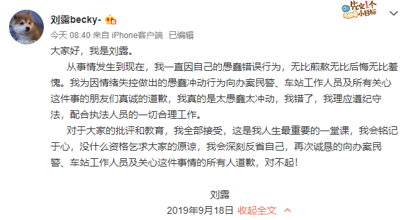 18日上午,刘露在微博发表道歉。她表示,“我一直因自己的愚蠢错误行为,无比煎熬无比后悔无比羞愧。我为因情绪失控做出的愚蠢冲动行为向办案民警、车站工作人员及所有关心这件事的朋友们真诚的道歉,我真的是太愚蠢太冲动,我错了,我理应遵纪守法,配合执法人员的一切合理工作。”