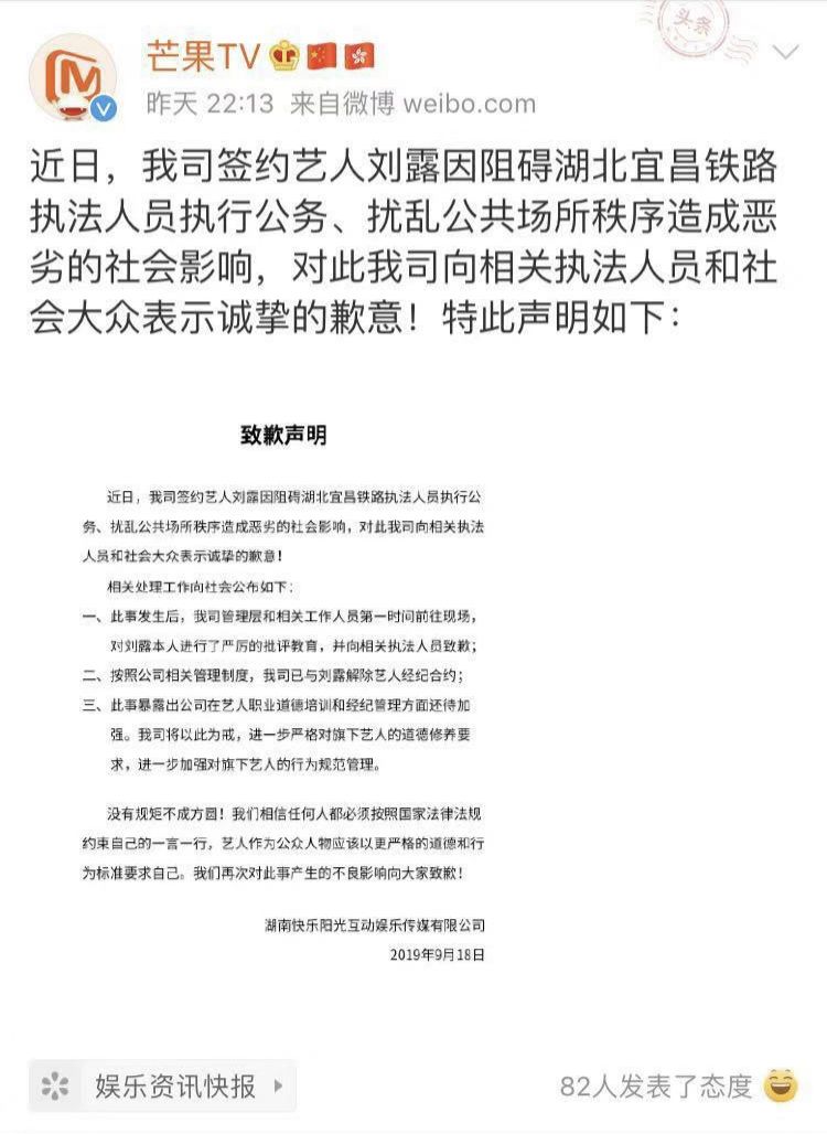 9月18日,芒果TV对此事进行回应,表示已与刘露解除艺人经纪合约。