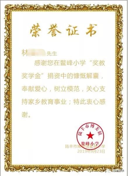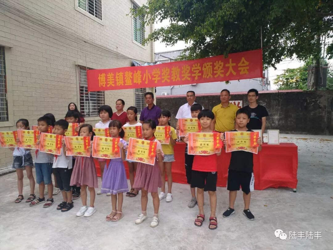 2019年9月23日下午,陆丰市博美镇鳌峰小学举行奖教奖学颁奖活动,出席颁奖活动有该村村委书记林珠好、校长林玉城、热心人士林春露、林奔腾、林双然及该校师生。