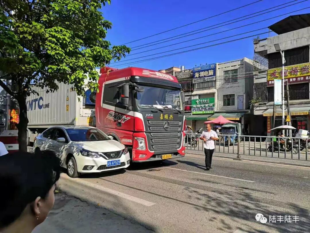 2019年9月12日,早上08:43分左右,在国道G324线陆丰博美穿城路段,往内湖方向,博美广场路口附近,友谊摄影对面,再发生一起交通事故,一辆大货柜车与一辆白色小轿车发生擦碰,无人员伤亡,事故发生后交警到场处理,交通依然大塞车,事故详情待有关部门通报为准!