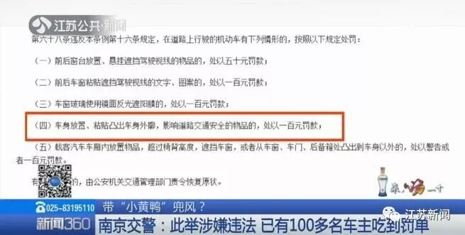 据《南京市道路交通安全条例》,车身放置、粘贴凸出车身外廓,影响道路交通安全的物品的,将面临100元的罚款。