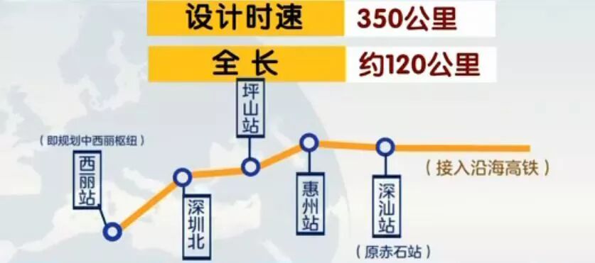 线路由深圳西丽站向东引出,途经位于龙岗区宝龙街道辖区内的深圳坪山站、惠州南站,至深汕合作区赤石站。