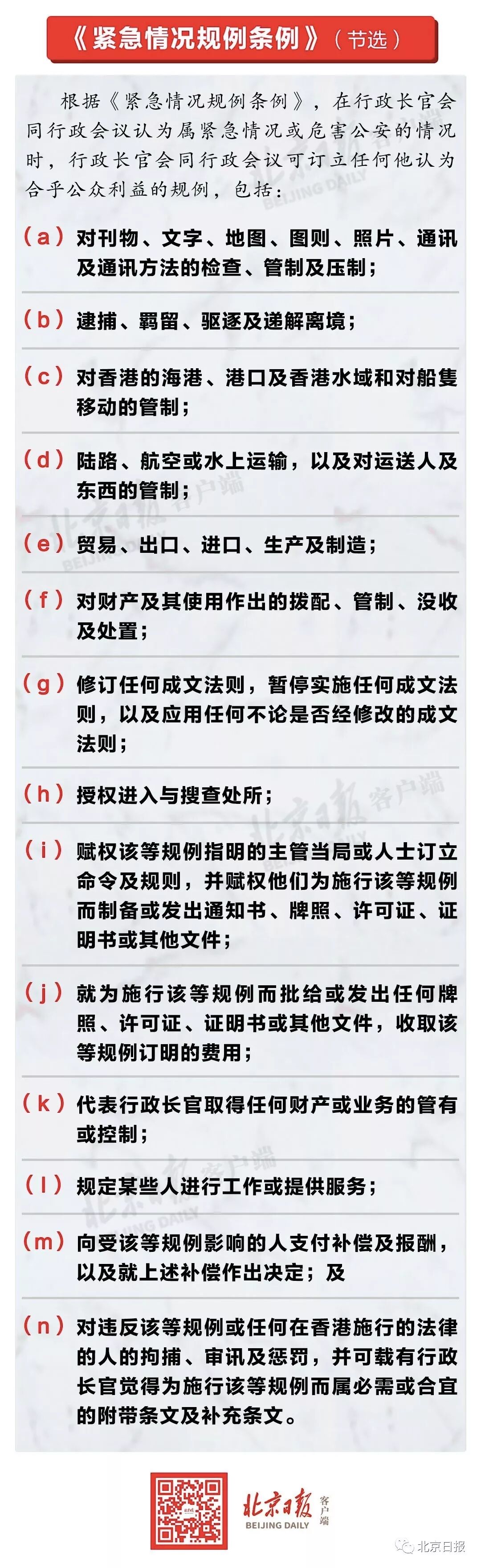 “紧急法”是指香港现行法例第241章《紧急情况规例条例》,《条例》授予了行政长官会同行政会议在紧急或危害公安的情况时订立规例的权力。从所列可以订立的规例来看,这确是一部“重典”,包括检查、管制及压制刊物、照片及通讯等,也可直接修改现时法例,并可规定刑罚,包括终身监禁。为尽快止暴制乱,早前香港社会各界人士便已呼吁启用“紧急法”。香港特区律政司司长郑若骅9月11日接受采访时表示,港府一直就现时的情况进行研究,对“紧急法”也有相关研究,亦会考虑该法适用的因素和影响。多位法律界人士也表示“紧急法”是授权特首和行政会议通过法律手段止暴制乱的“尚方宝剑”。政府可以考虑从禁止指定地点集会、限制酝酿暴力冲击的通讯及限制被禁物品运输等方面作出规定。他们指出,无须担心所谓“权力无法制约”,因市民完全可以提出司法覆核。![]()