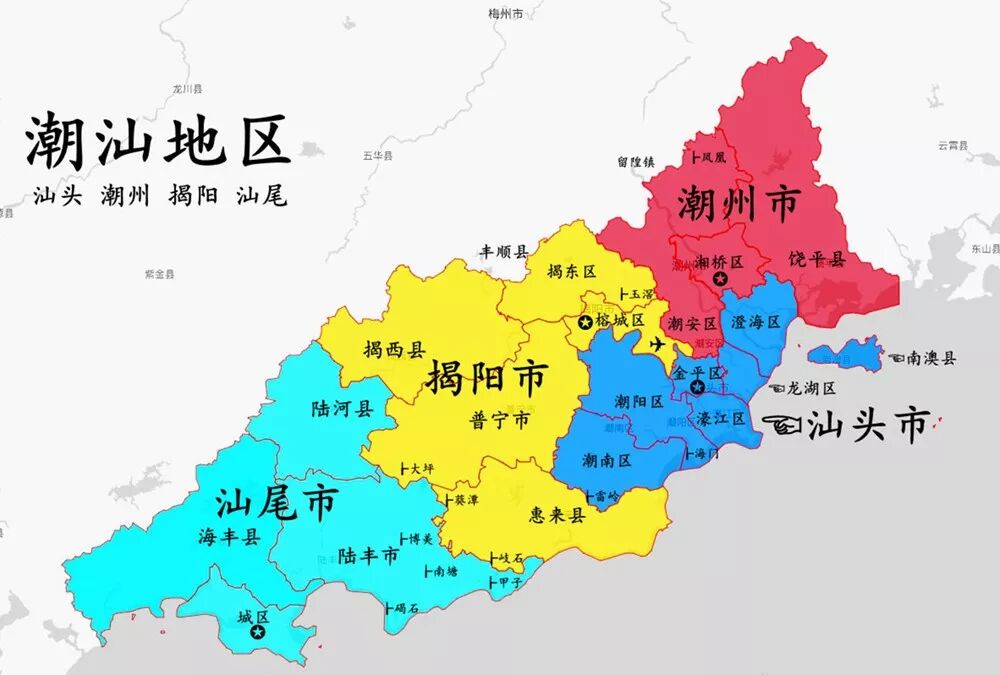 “大潮汕地区”指汕头、潮州、揭阳、汕尾四市区域,潮汕四市涵盖11区6县及2县级市普宁、陆丰,总常住人口1800多万,总面积16189.5平方公里。