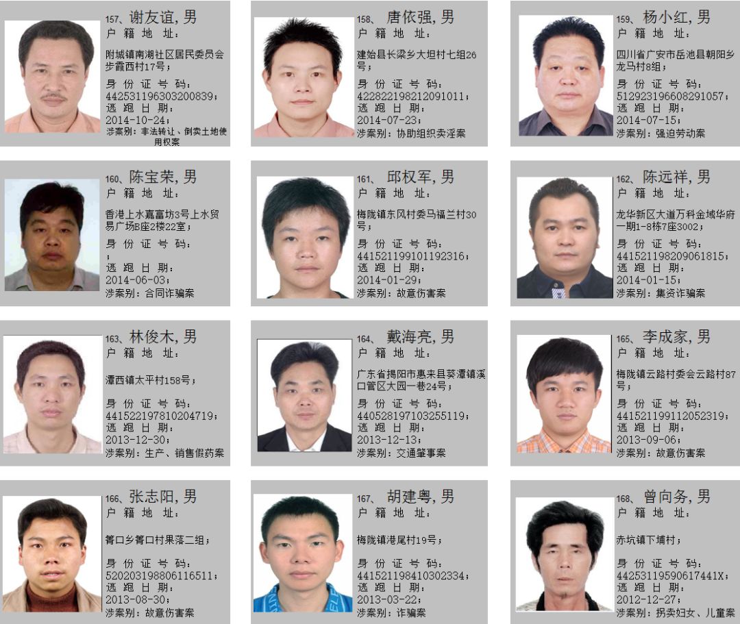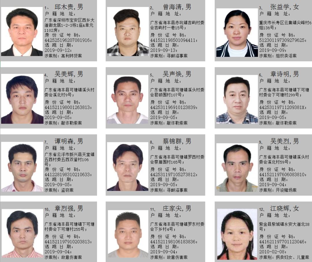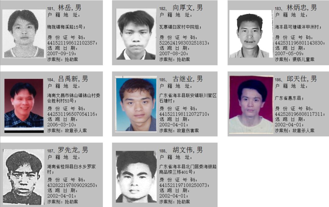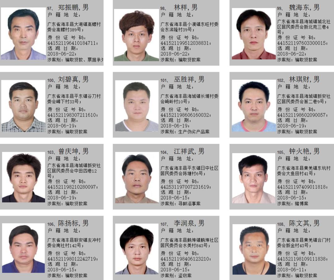 2019年7月10日,海丰县公安局悬赏发布至今,共有148名在逃人员到案。在此,我局再次敦促在逃人员在以下通告规定时间内投案自首,争取从轻处理。