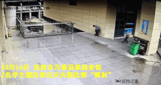 10月16日,在江西宜春万载某商业街,2个孩子放学后路过商场,擅自拿出灭火器比赛喷射。