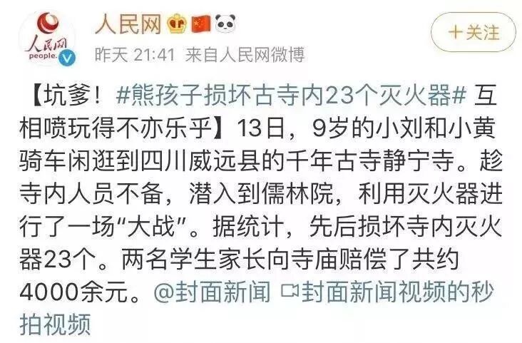 “好东西”肯定要一起分享,过了几天,这俩熊孩子又叫来了一帮“同伙”,在商业街开始了一场灭火器的狂欢......前前后后折腾下来,共导致11个灭火器损坏。