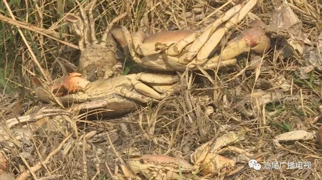 当时我慢慢抽水,到水干的时候看到底下有毒液。刚开始还不知道,以为是塘底下发臭。你看两边都有鱼塘,都不会死,就单单我这个鱼塘的螃蟹死了。螃蟹发病死的话它只会死一两只,不会死这么多。