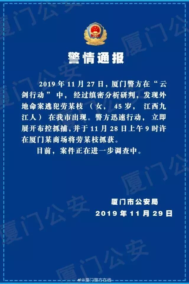 据福建省厦门市公安局官方微博29日的通报,2019年11月27日,厦门警方在“云剑行动”中,经过缜密分析研判,发现外地命案逃犯劳某枝(女,45岁,江西九江人)在厦门市出现。警方迅速行动,立即展开布控抓捕,并于11月28日上午9时许在厦门某商场将劳某枝抓获。目前,案件正在进一步调查中。