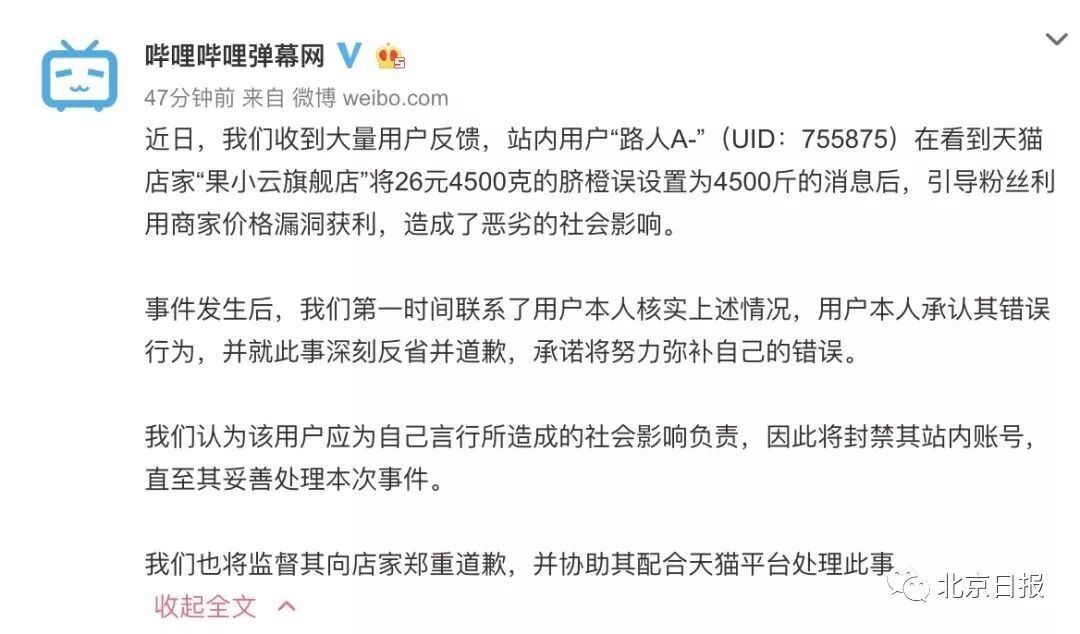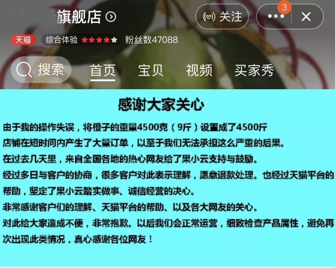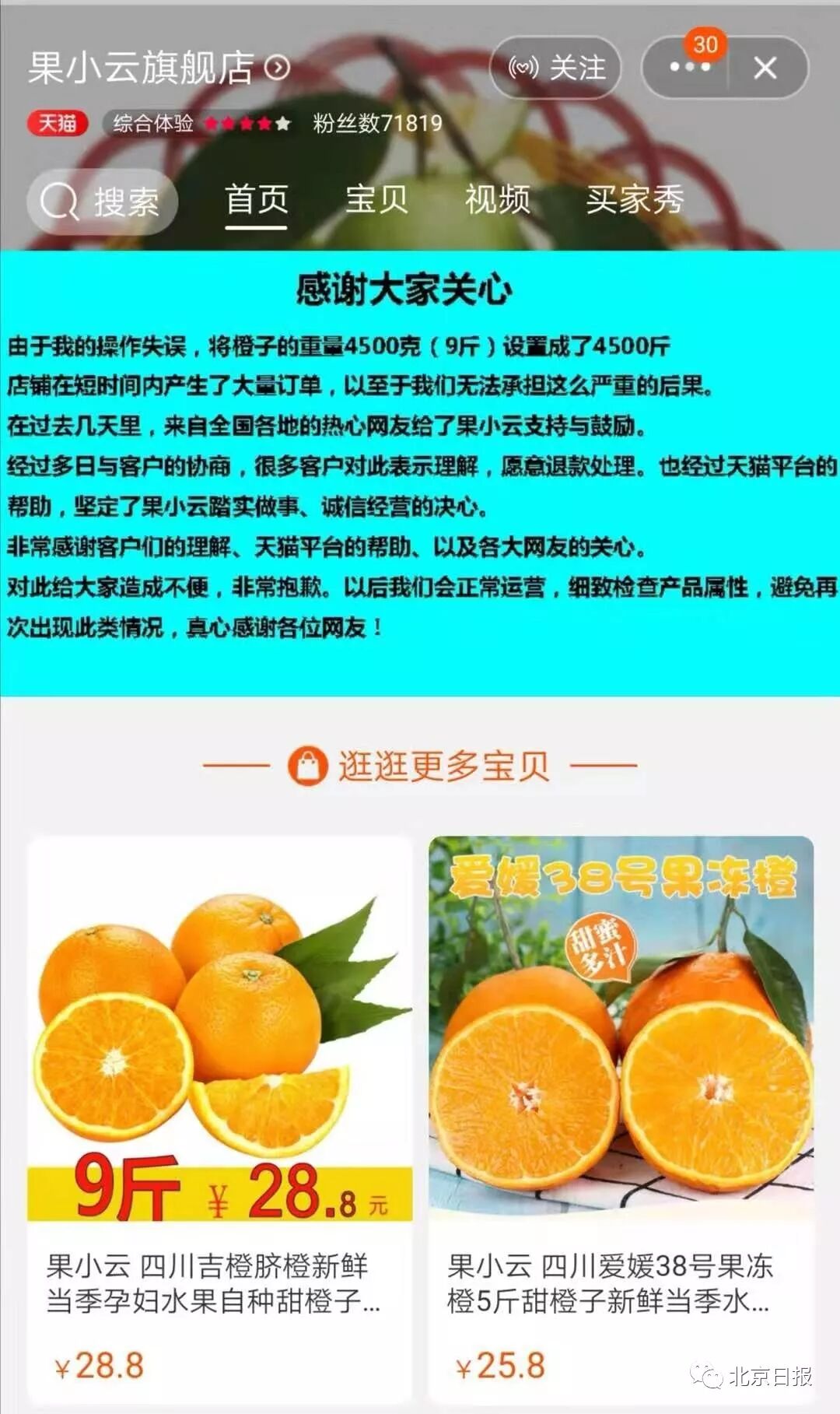 近日,淘宝店家“果小云”因操作失误,误将26元4500克的脐橙写成了4500斤后,B站博主“路人A-”在直播时号召粉丝去“薅羊毛”,随后,上万粉丝涌入“果小云”的店铺下单,一晚上订单量达到了近20万,涉及金额700万。