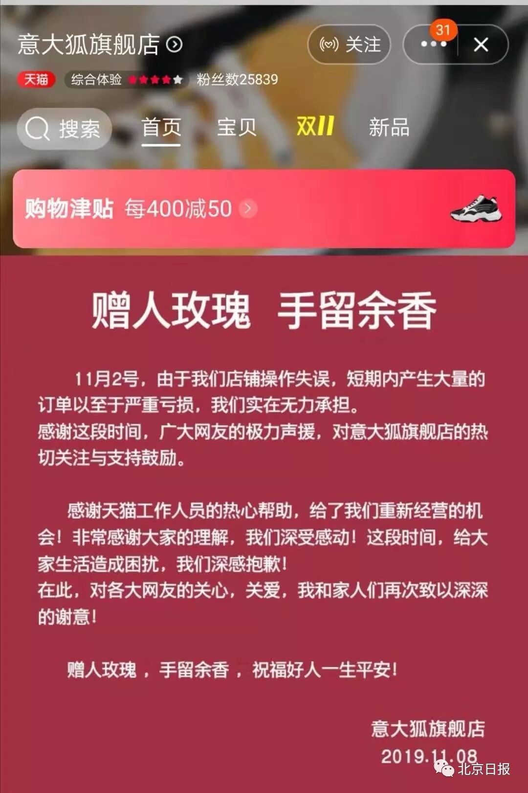 此外,另一家曾因操作失误而导致被“薅垮”的店铺“意大狐”也恢复运营,截至今天上午,已陆续上架14件商品,其粉丝数也上涨至2万5千多。在店铺首页的公告中,该店称:“11月2日,由于我们店铺操作失误,短期内产生大量的订单以至于严重亏损,我们实在无力承担,感谢这段时间广大网友的极力声援,感谢天猫工作人员的热心帮助,给了我们重新经营的机会,我们深受感动。赠人玫瑰,手留余香,祝福好人一生平安!”