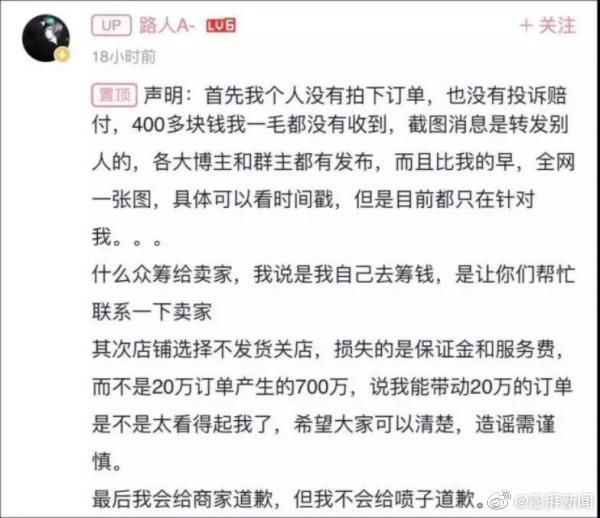 消息一出,立刻引起舆论哗然,网友怒指“路人A-”的行为太过恶意,结果,“路人A-”曾在个人账号回应称,自己没有下单,赔付款也没有拿到,全网都在针对他。至于店家的损失,他表示“店铺不发货关店,损失的也不是20万订单产生的700万费用,只是保证金和服务费而已。”