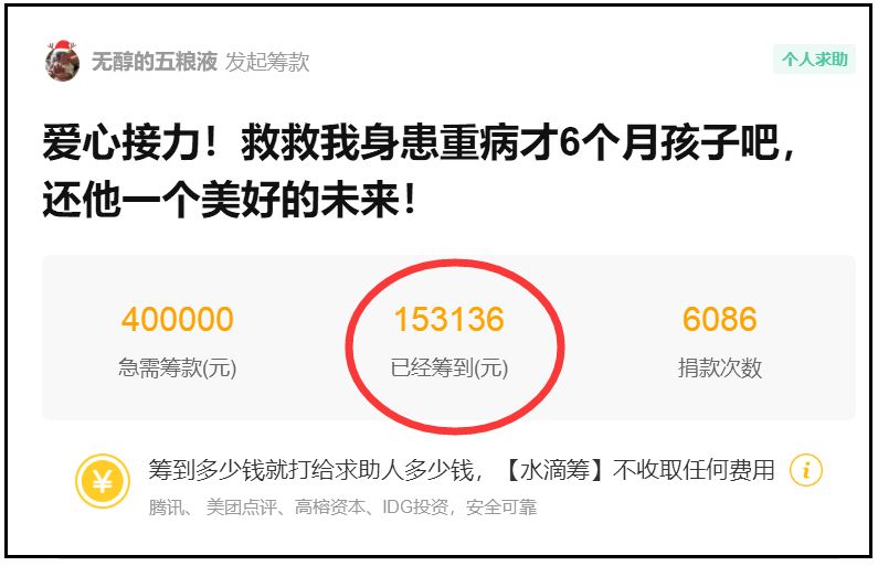 2018年4月,莫先生想到了利用“水滴筹”进行网络筹款。当年4月15日,莫先生在水滴筹发起了筹款目标为40万元的个人大病筹款项目,他说:“我是为我身在重症监护室的孩子发起求助的……这5个月来,孩子饱受疾病折磨,为了给他看病已经花光了家里的全部积蓄,欠下了20多万的外债,医生说要做好长期的治疗准备,后续至少要40万元左右的治疗费用,但我们家就是工薪家庭,我和妻子的工资根本不足以支付孩子的治疗费用,可谁能眼睁睁看着自己的孩子被病魔折磨呢?他是我们家唯一的希望啊!”