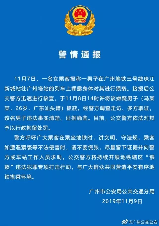 接报后公交警方迅速进行核查,于11月8日14时许将该嫌疑男子(马某某,26岁,广东汕头籍)抓获。经警方调查走访、多方取证,该名男子违法事实清楚、证据确凿。目前,公交警方依法对其予以行政拘留处罚。