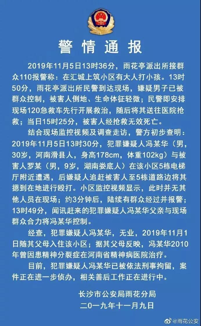 冷血旁观?警方通报“长沙9岁孩子被殴打致死”事件过程。11月5日中午,长沙市雨花区一小区,一名9岁男孩被一名中年男子掐脖窒息身亡。今天,长沙市公安局雨花分局官方微博通报了这一案件情况。